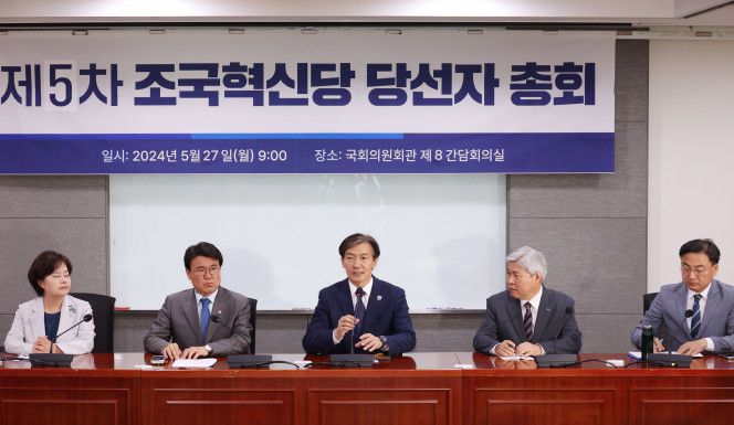 27일 국회에서 열린 제5차 조국혁신당 당선자 총회에서 조국 대표가 발언을 하고 있다.
