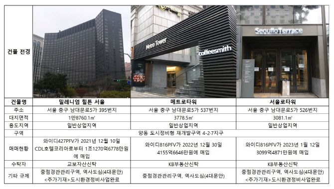 이지스자산운용은 서울역 근처에 있는 밀레니엄 힐튼 서울(힐튼호텔), 서울로타워, 메트로타워 3개 건물을 묶어서 개발할 계획이다. 세 건물이 서로 시너지를 낼 수 있도록 개발 밑그림을 그리겠다는 것이다.