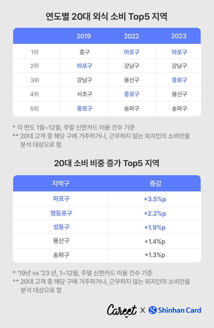 지난 5년 간(2019~2023년)의 데이터를 분석하니 20대가 주말에 외식을 위해 자주 찾는 지역이 바뀌었음을 알 수 있었다. 2019년만 해도 명동·충무로·남산 등이 위치한 중구가 1위로 가장 많은 이용 건수를 보였으나, 작년에는 홍대·합정·상수 상권을 중심으로 20대의 소비가 이루어지면서 마포구가 1위로 올라섰다. 마포구는 홍대 상권이 연남·망원 지역으로 확장되고, 아이돌 생일 카페 문화가 해당 상권으로 집중되면서 더욱 각광을 받고 있다. 그 뒤를 강남구와 종로구가 이었다.