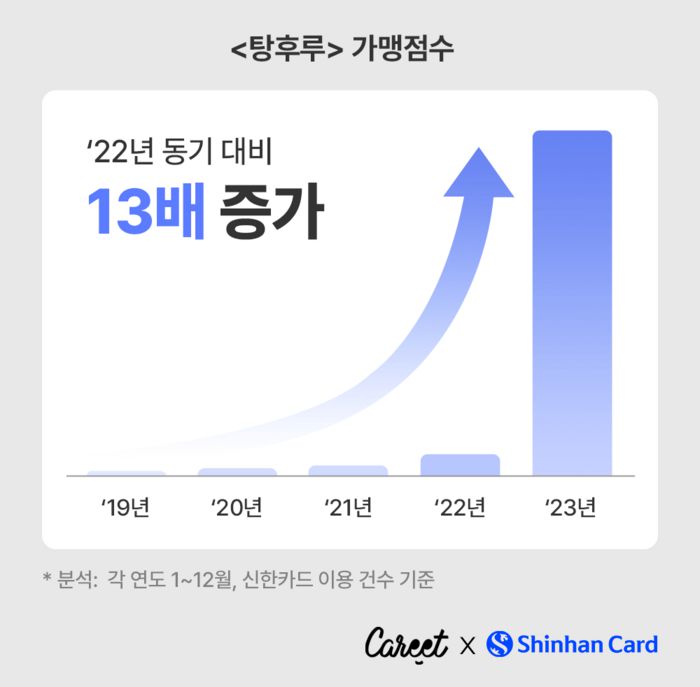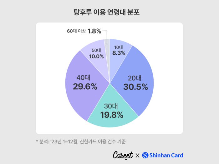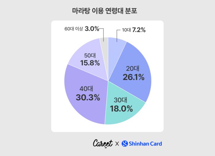 또 자극적이고 중독적인 맛으로 유명한 마라탕과 탕후루의 인기는 아직도 유효한 것으로 나타났다. 2023년 12월부터 2024년 2월까지 이용 건수를 기준으로 마라탕 이용 연령대를 분석해 보니 10대(7.2%)와 20대(26.1%)를 합친 비율이 33.3%로 나타났다.