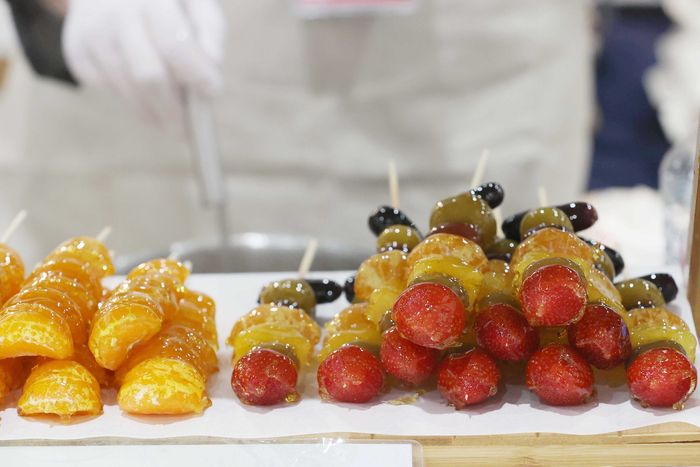 서울 강남구 세텍에서 열린 딸기 전문 박람회 ‘2024 서울 스트로베리 페스타’에서 부스 관계자가 탕후루 등 디저트를 만들고 있다. 사진 | 연합뉴스