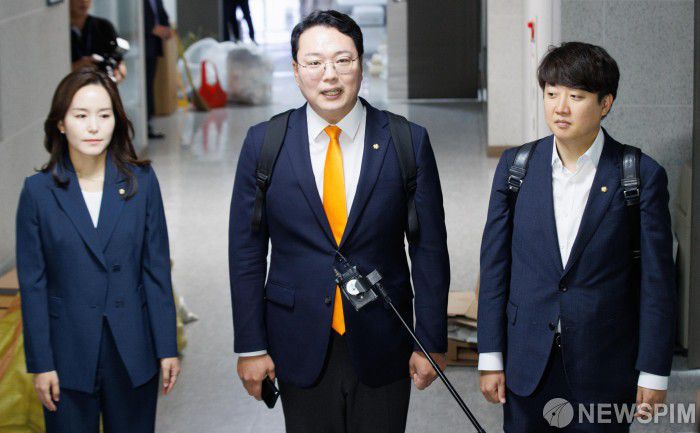 [서울=뉴스핌] 윤창빈 기자 = 천하람 개혁신당 의원이 30일 오전 서울 여의도 국회 의원회관 사무실로 들어서며 취재진의 질문에 답변하고 있다. 2024.05.30 pangbin@newspim.com