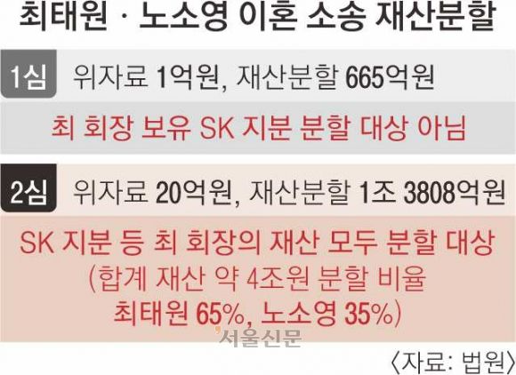 재판부는 두 사람의 합계 재산을 약 4조원으로 보고 재산분할 비율을 최 회장 65%, 노 관장 35%로 정했다. 위자료도 1심의 1억원을 20억원으로 증액했다. 최 회장과 김희영 티앤씨재단 이사장의 혼외 관계에 대해 재판부는 “최 회장이 소송 과정에서 부정행위에 대해 진심으로 반성하는 모습을 보이지 않고 일부일처제를 전혀 존중하지 않는 태도를 보이고 있다”고 질타하기도 했다.