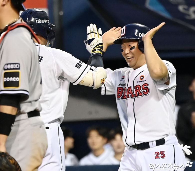 일례로 곽빈은 이날 3회초 2사 만루서 오재일에게 커브를 던져 헛스윙 삼진을 끌어냈다. 양의지는 "(오재일을 보니) 첫 타석에서 패스트볼에 타이밍이 좋은 듯해 빈이가 자신 있어 하는 공으로 승부하려 했다. 그래야 맞더라도 후회 없을 것 같았다"며 "빈이가 정말 좋은 코스에 공을 잘 던졌다. 덕분에 스윙이 나왔다"고 미소 지었다.