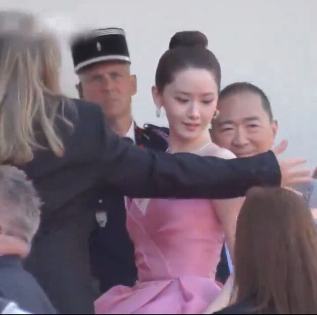지난 19일(현지시각) 칸국제영화제 레드카펫에 들어선 걸그룹 ‘소녀시대’ 출신 윤아가 뒤돌아보려 하자 칸영화제 보안 요원이 이를 막고 있다. 엑스(X·옛 트위터) 갈무리 |