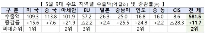 5월에는 9대 주요 수출지역 중 유럽연합(EU)과 독립국가연합(CIS)을 제외한 7개 지역 수출이 증가했다. 중국이 미국을 제치고 다시 1위 수출국이 됐다.