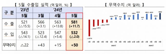 산업통상자원부와 관세청은 1일 '2024년 5월 수출입동향'을 발표하고 지난달 수출이 전년 동월 대비 11.7% 증가한 581억5000만 달러(약 80조5377억원)로 집계됐다고 밝혔다.