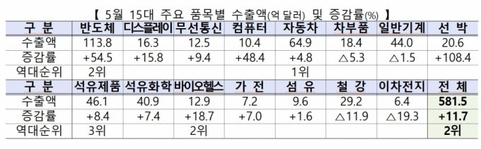5월에는 15대 주력 수출품목 중 11개 수출이 증가했다. 반도체, 디스플레이, 컴퓨터, 무선통신기기 등 정보통신기술(IT) 전 품목이 3개월 연속 플러스를 기록했다. 합산 수출액도 7개월 연속 증가했다.