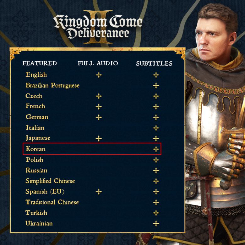 킹덤 컴: 딜리버런스 2를 개발하는 워호스 스튜디오는 6월 1일 자사 공식 X(트위터)를 통해 공식 지원하는 언어 목록을 발표했다. 출시 기준으로 총 15개 언어를 지원하며, 여기에는 한국어도 포함되어 있다. 음성 지원은 없지만 한국어 자막을 제공하기에 국내 유저들도 언어에 대한 어려움 없이 플레이 가능할 것으로 예상한다.