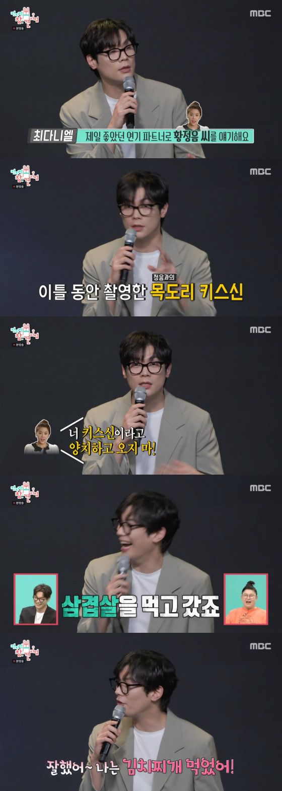 이날 최다니엘은 제일 좋았던 연기 파트너로 황정음을 꼽았다. 그는 "목도리 키스신 찍을 때 이틀을 찍었는데 먼저 황정음 씨가 '키스신이라고 양치하고 오지마. 담배까지 펴도 돼'라고 해줬다"며 '지붕 뚫고 하이킥' 당시 황정음의 사소한 배려를 언급했다.