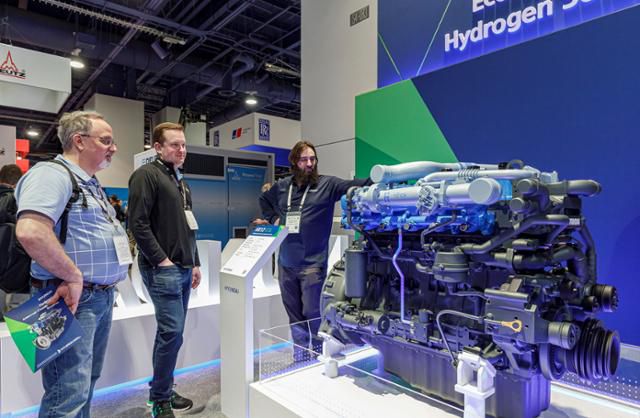 지난해 미국 네바다주 라스베이거스에서 열린 북미 최대 건설자재·장비 전시회 CONEXPO 2023에서 관람객들이 HD현대인프라코어의 수소연소엔진 'HX12' 시제품을 주의 깊게 살펴보고 있다. HD현대인프라코어 제공 |