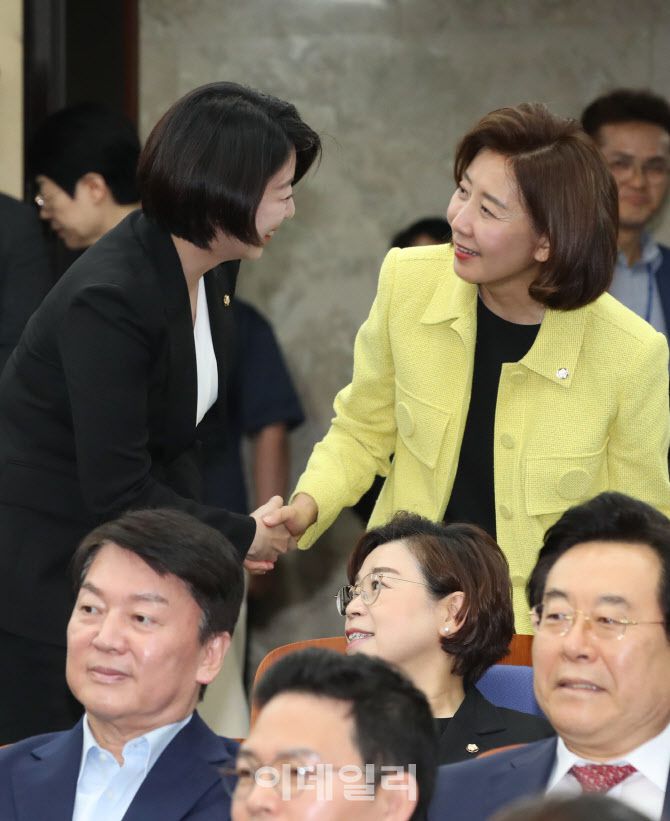 [이데일리 노진환 기자] 나경원(오른쪽), 배현진 국민의힘 의원이 3일 오후 서울 여의도 국회에서 열린 의원총회에 참석, 악수하며 인사를 하고 있다.