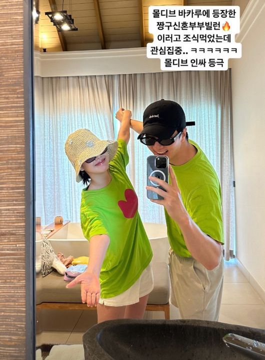 공개된 사진에는 몰디브로 신혼여행을 떠난 천둥과 미미의 모습이 담겨 있었다. 이들은 커플 티셔츠를 맞춰 입고 거울을 보고 포즈를 취하며 밝게 미소 짓고 있다. 둘만의 신혼여행을 즐기고 있는 모습이었다.