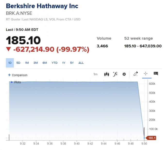 뉴욕증권거래소(NYSE)가 기술적인 문제로 인해 워렌버핏이 소유한 세계 최대 투자지주사인 버크셔해서웨이A 주식 가격을 99% 이상 하락한 것으로 나타내고 있다.