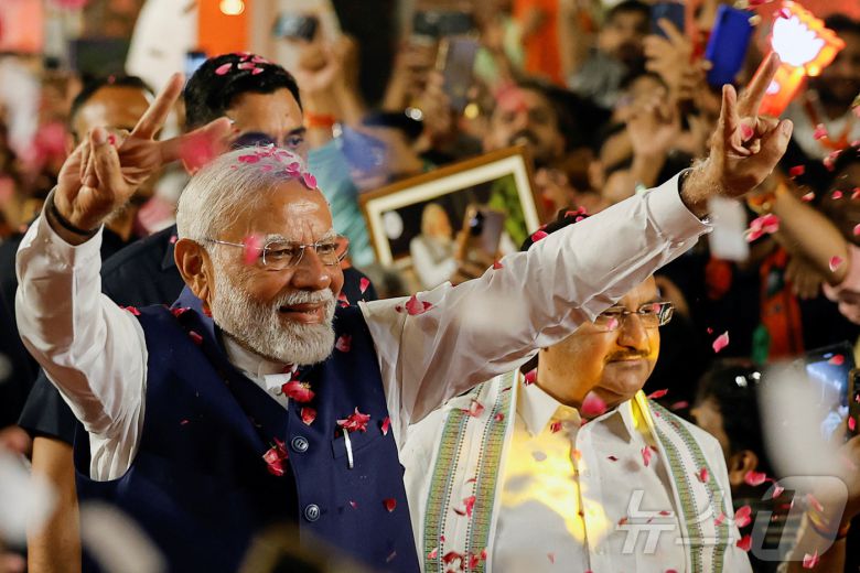 (서울=뉴스1) 권진영 기자 = 나렌드라 모디 인도 총리(73)가 4일(현지시간) 자신이 이끄는 인도국민당(BJP) 본부에서 "큰 결정의 새로운 장을 쓰겠다"며 승리 연설을 진행했다.