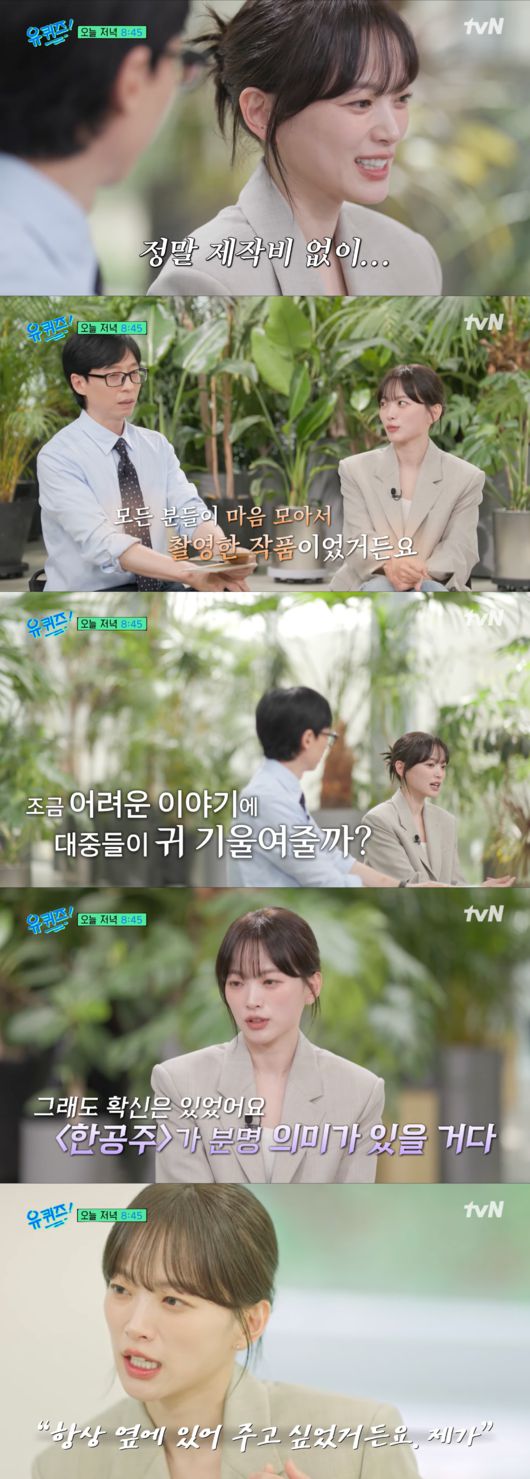 이날 유재석은 “데뷔 10년 만에 터닝포인트가 된 작품이 있다. 이게 독립영화 ‘한공주’”라고 소개했고, 천우희는 “정말 제작비 없이 모든 분들이 그냥 마음 모아서 촬영한 작품이었다”라고 설명했다.