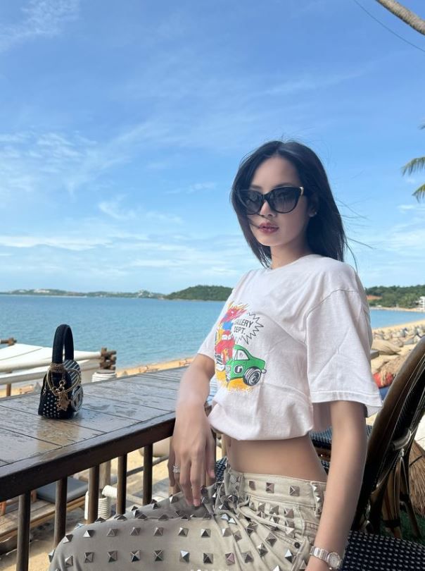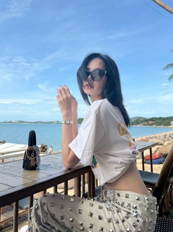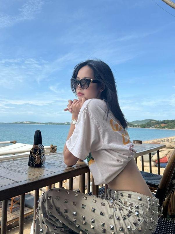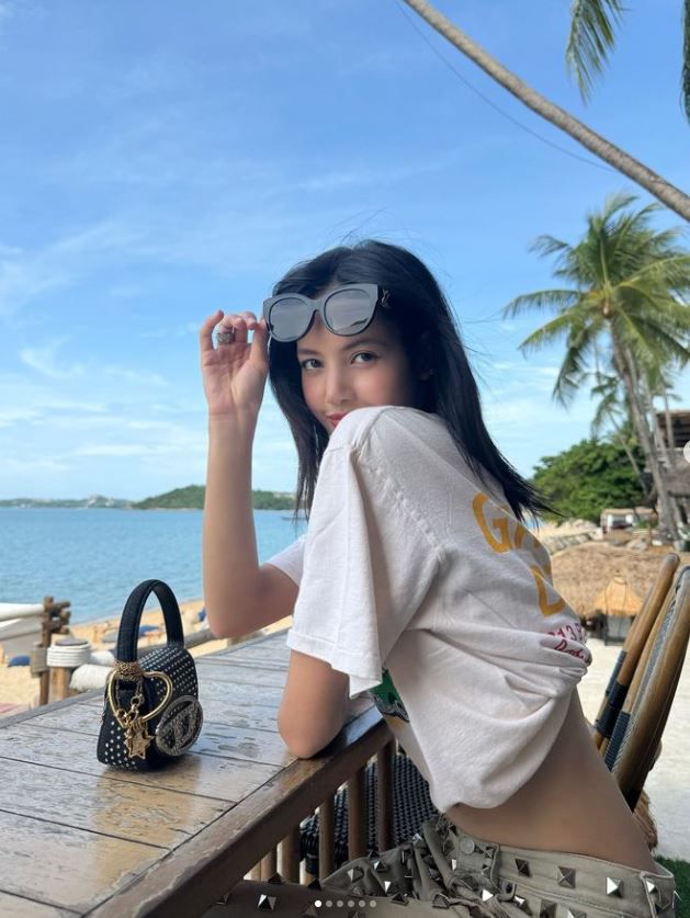 해변가에 앉아 포즈를 취한 리사는 루이비통 선글라스에 흰색 티셔츠를 말아올려 늘씬한 허리 라인을 강조했다.