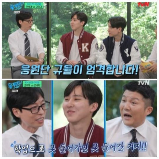 5일 방송된 tvN 예능프로그램 ‘유 퀴즈 온 더 블럭’(이하 ‘유퀴즈’)에서는 고려대학교 응원단장 박진혁과 연세대학교 응원단장 남윤재 씨가 출연한 ‘왕좌의 게임’ 특집이 펼쳐졌다.