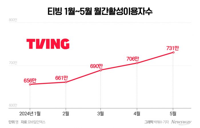 2024년 티빙 1월부터 5월까지 월간 활성 이용자 수(MAU). 그래픽=박혜수 기자