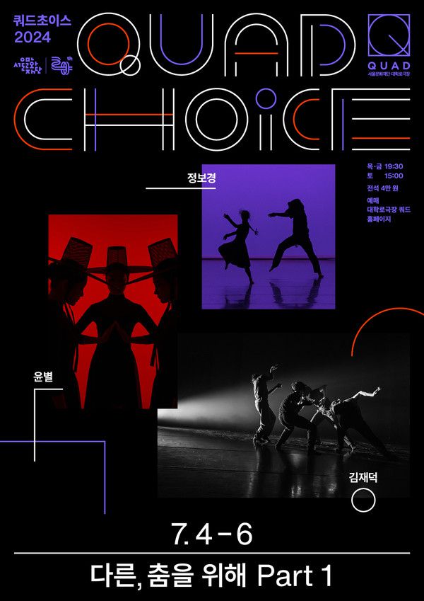 한편, 대학로극장 쿼드의 7월 쿼드초이스 '다른, 춤을 위해' 티켓은 7일부터 서울문화재단 대학로극장 쿼드 누리집에서 예매 가능하다. 티켓 오픈과 함께, 쿼드초이스 '쿼-댄스 패키지' 티켓 총 100매를 기간 한정(7~11일, 5일간)으로 선착순 판매한다.