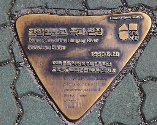 교체된 동판에는 이렇게 새겨져 있다. ‘한강 인도교 폭파 사건. 6·25 발발 직후의 교량 폭파로 군중 500~800명의 인명 피해 추정 – 인권 담당관’
