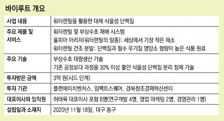 새로운 발견은 기회로 이어지기 마련이다. 대구 군위군에 연구소를 두고 있는 ‘바이루트’는 수초(水草)인 개구리밥에서 그런 기회를 찾았다. 개구리밥의 단백질 함량이 콩보다 많고, 이틀이면 개체 수가 2배로 늘어날 정도로 성장 속도가 빠르다는 것을 알게 되면서다.
