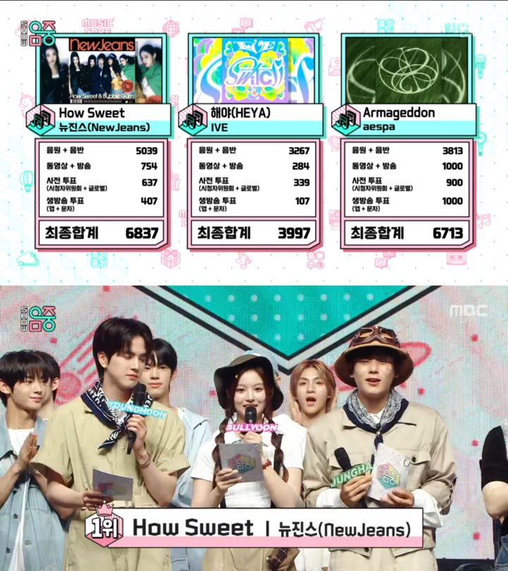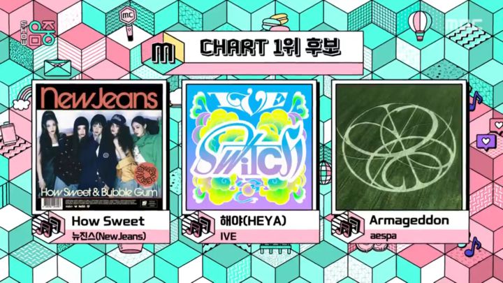 8일 오후 MBC '쇼! 음악중심' 858회가 방송했다. 1위 후보는 뉴진스 'How Sweet'(하우 스위트), 아이브(IVE) 해야(HEYA), 에스파(aespa) 'Armageddon'(아마겟돈)이 이름을 올렸다.
