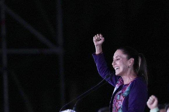 3일(현지 시각) 수도 멕시코시티의 소칼로 광장에서 클라우디아 셰인바움 멕시코 대선 후보가 멕시코 헌정사 최초로 여성 대통령에 당선이 확정된 후 지지자들에게 인사하고 있다. [사진=멕시코시티=AP/뉴시스] |