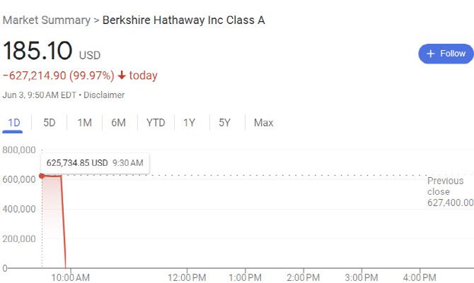 일련의 사건은 이렇다. 뉴욕증권거래소(NYSE) 전산 오류로 인해 3일(현지시간) 오전 9시 50분께 버크셔해서웨이A, 뉴스케일파워 등의 종목 주가가 본래 가격보다 99% 낮게 표시됐다. 예컨대 버크셔해서웨이A 주가는 전장보다 99.97% 폭락한 185.10달러로 시세가 표시됐다.