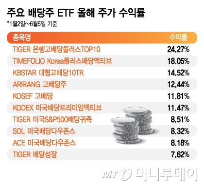 7일 한국거래소에 따르면 국내 증시에 상장한 주요 배당주 ETF(상장지수펀드) 중 올해 가장 높은 수익률을 올린 상품은 'TIGER 은행고배당플러스TOP10'이다. 연초 이후 지난 5일까지 24.27% 상승했다.