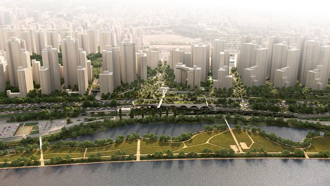 서울시 ‘반포지구 한강연결공원 및 문화시설 조성’ 국제설계공모에서 1등작으로 뽑힌 안의 올림픽대로 덮개공원 상부의 모습. 서울시 제공