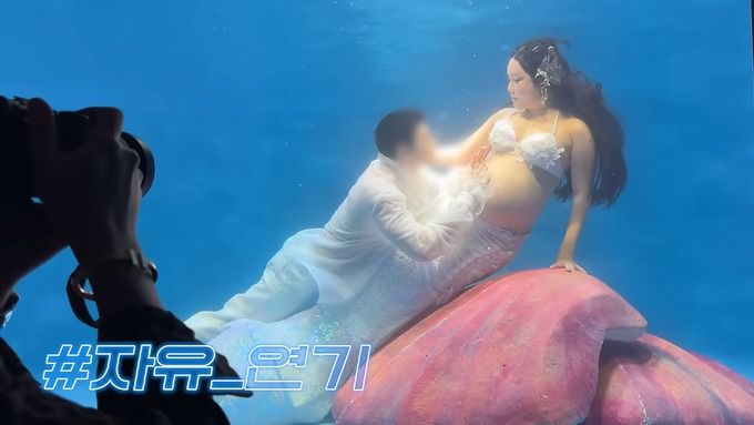 영상 속 랄랄은 “보고 있니? 엄마 아빠는 인어 공주 놀이를 하고 있단다”라며 특별한 웨딩화보 촬영에 돌입했다. 그는 수중 만삭 촬영을 준비하며 “무슨 연극, 경극 하는 사람처럼 되셨는데 너무 진한 거 아니에요? 저승사자 같아”라며 예비신랑과 티키타카를 보이기도 했다. 이어 “나는 오늘 인어 공주야”라며 수중 화보 촬영에 돌입했다.