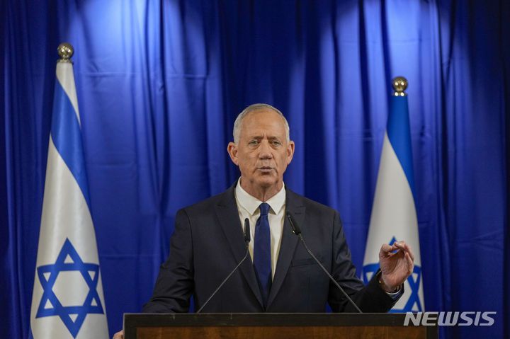 [라마트간=AP/뉴시스] 이스라엘 중도파 베니 간츠 국가통합당 대표가 9일(현지시각) 이스라엘 라마트간에서 기자회견을 열고 전시 내각 사임을 발표하고 있다. 간츠 대표는 베냐민 네타냐후 총리가 미국의 종전계획 제시안도 거부하는 등 가자 전쟁에 잘못된 처사를 하고 있으며, 국가 안보에 필요한 조처보다 자신만의 '정치적 생존'을 위해 행동하고 있다고 비난했다. 2024.06.10.