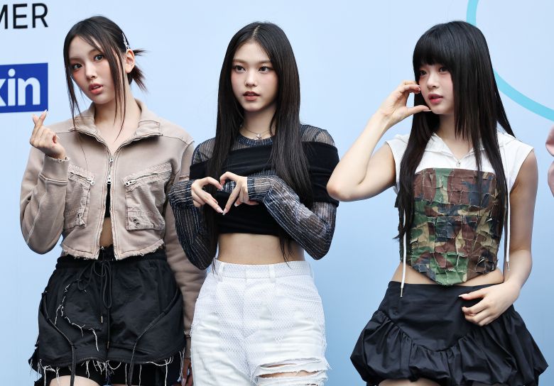 그룹 뉴진스 혜인(왼쪽부터), 해린, 하니가 각각 다른 손하트 포즈를 취하고 있다. /뉴스1 |