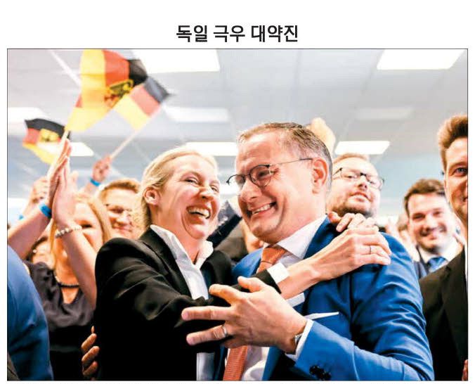 9일(현지시간) 독일에서 치러진 유럽의회 선거에서 2위를 차지한 극우 정당 '독일을 위한 대안'의 알리스 바이델 부대표(왼쪽)와 티노 크루팔라 공동대표가 환호하고 있다. EPA연합뉴스 |
