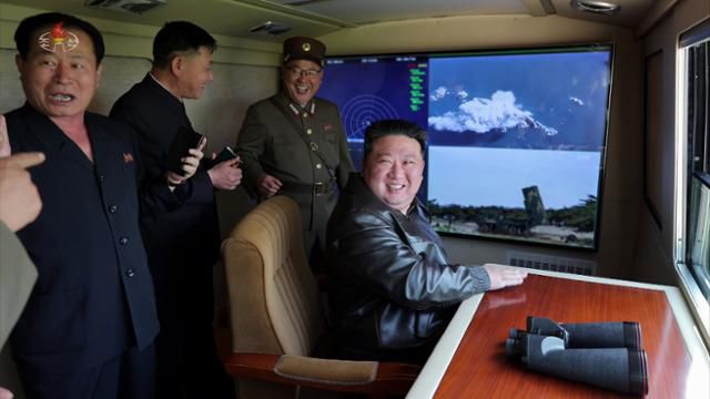 김정은(맨 오른쪽) 북한 국무위원장이 지난달 17일 조선동해상에서 실시된 전술탄도미사일 시험사격을 참관하고 있다. 18일 조선중앙TV가 보도한 화면이다. 조선중앙TV 캡처·뉴시스
