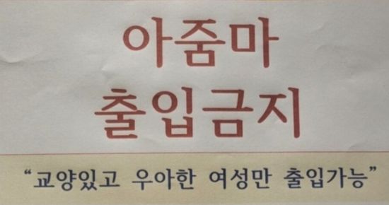 안내문에는 빨간 글씨로 "아줌마 출입 금지"라고 쓰여있는 것뿐만 아니라 "교양있고 우아한 여성만 출입 가능"이라는 다소 황당한 문구가 있다. 게다가 바로 아래는 "아줌마와 여자 구별법"이라면서 총 8가지 항목이 나열돼 있었다. [사진출처=JTBC 사건반장] |