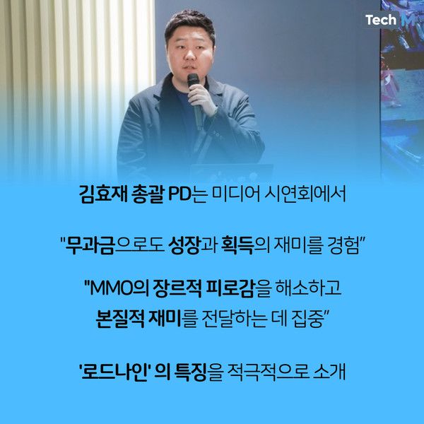 김효재 PD는 5월 31일 MMORPG '로드나인' 미디어 시연회에서 "무과금으로도 성장과 획득의 재미를 느낄 수 있도록 개발됐다"며 "MMO에서 오는 장르적 피로감을 해소하고 보다 본질적 재미를 전달하는 데 초점을 맞췄다"고 강조했다.