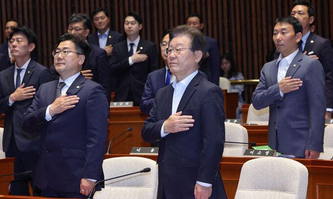 의총 참석한 李 더불어민주당 이재명 대표(앞줄 오른쪽)가 11일 국회에서 열린 의원총회에서 국기에 대한 경례를 하고 있다. 이재문 기자