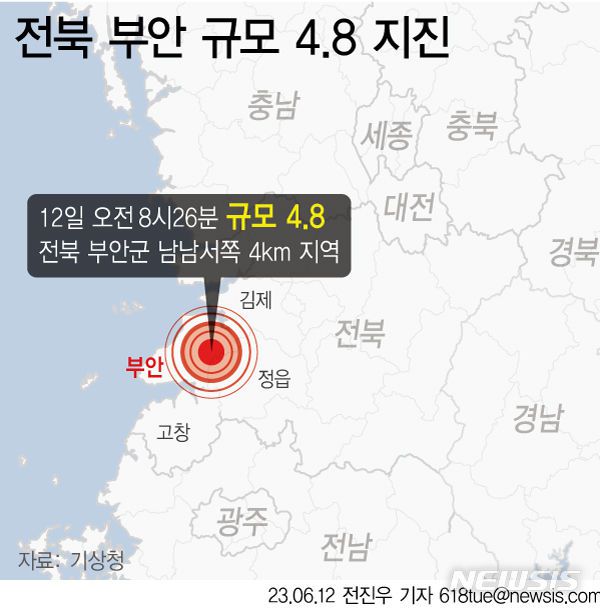 [서울=뉴시스] 12일 오전 8시26분49초 전북 부안군 남남서쪽 4㎞ 지역에서 규모 4.8의 지진이 발생했다. 이번 지진은 올해 한반도와 주변 해역에서 발생한 지진 중 규모가 가장 크다. (그래픽=전진우 기자) 618tue@newsis.com |