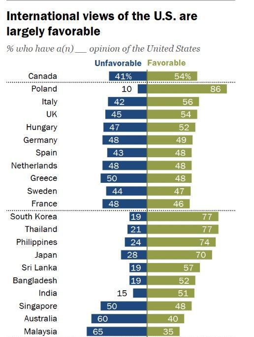 캐나다는 이념적 분열의 예로 꼽혔다. 자신을 우파라고 여기는 성인의 66%가 미국에 호의적이었으나 좌파는 37%로 낮았다.