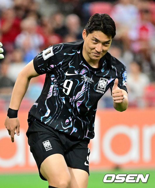 [OSEN=칼랑(싱가포르), 조은정 기자]김도훈 임시감독이 이끄는 대한민국과 싱가포르의 2026 FIFA북중미 월드컵 아시아 2차 예선 C조 5차전이 6일(한국시간) 오후 9시 싱가포르 칼랑에 위치한 싱가포르 더 내셔널 스타디움에서 열렸다.각 조 12위에 3차 예선 진출 자격이 주어지는 가운데 한국은 싱가포르와 5차전에서 비기기만 해도 11일 중국과 6차전 경기 결과와 상관없이 3차 예선행을확정한다. 심지어5차전에서 한국이 패해도태국이 승점을 챙기지 못한다면3차 예선으로 향할 수 있다.전반 대한민국 주민규가 동료들에게 엄지를 들어 올리고 있다. 2024.06.06 /cej@osen.co.kr