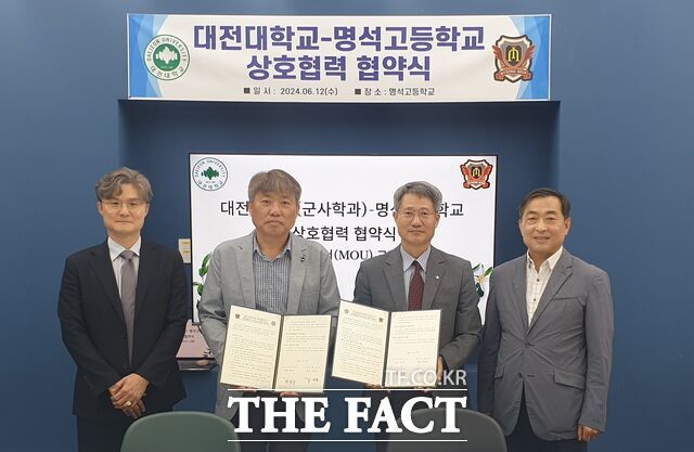 [더팩트ㅣ대전=이영호 기자] 대전대학교(총장 남상호)는 12일 명석고등학교에서 군사학과 교수 및 학교 관계자 10여 명이 참석한 가운데 양교 간 상호발전 및 군사전문가 양성을 위한 MOU를 체결했다.