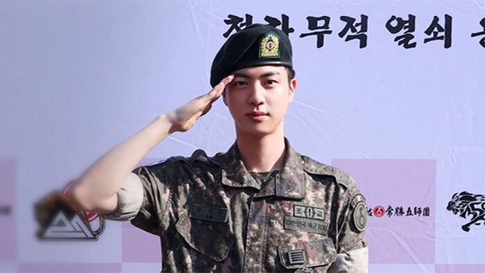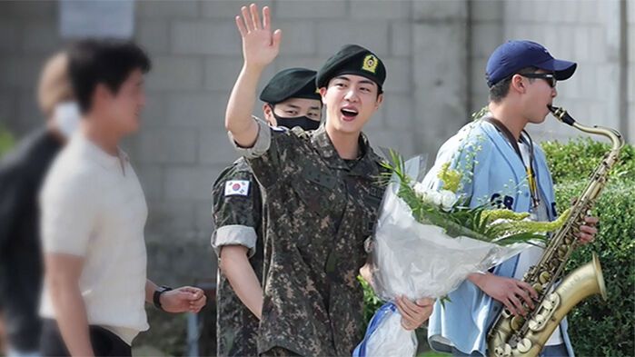 거수경례로 만기 전역을 알리며, BTS의 진으로 돌아왔습니다.