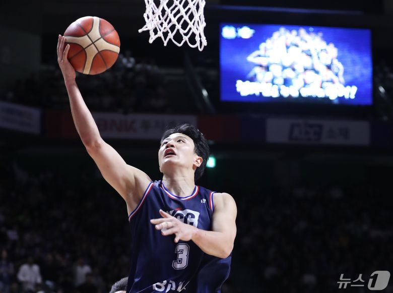 1일 오후 부산 사직실내체육관에서 열린 '2023-2024 정관장 프로농구' 챔피언 결정전 3차전 부산 KCC 이지스와 수원 KT 소닉붐의 경기에서 KCC 허웅이 레이업 슛을 하고 있다. 2024.5.1/뉴스1 ⓒ News1 윤일지 기자