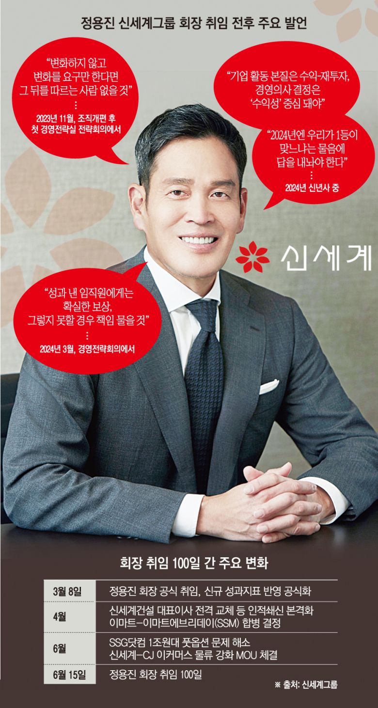 신세계그룹 관계자는 “C커머스(중국 이커머스)와 국내 이커머스의 물량 공세 속 오프라인 유통업체들이 생존 기로에 선 상황에서 과감한 변화는 선택이 아닌 필수”라며 “이 과정에서 정용진 회장이 취임 100일간 강력한 리더십을 바탕으로 쇄신을 단행했고, 연말까지는 고객의 시간을 점유하는 전략을 통해 그룹 전체의 수익성 개선에 주력할 것”이라고 전했다.