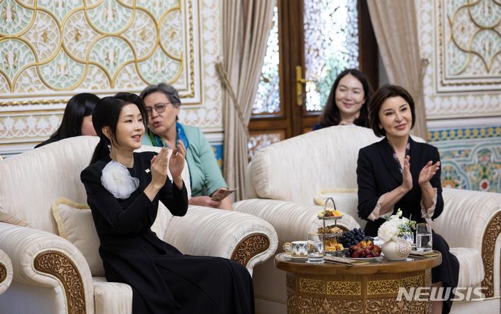 [타슈켄트(우즈베키스탄)=뉴시스] 조수정 기자 = 우즈베키스탄을 국빈 방문한 윤석열 대통령 부인 김건희 여사가 14일(현지시간) 타슈켄트 우즈베키스탄 대통령궁 히바동에서 지로아트 미르지요예바 우즈베키스탄 영부인과 우즈벡 전통 예식 재현을 보며 박수치고 있다. (공동취재) 2024.06.15. chocrystal@newsis.com