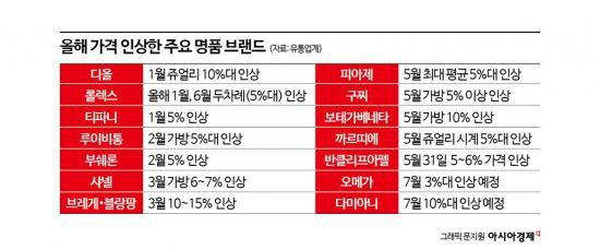 인상 예정인 업체로는 명품 시계 브랜드인 오메가(3%·추정치), IWC(5%) 등이 꼽힌다. 샤론스톤, 브래드피트 등 해외 연예인들의 다이아몬드로 알려진 이탈리아 명품 브랜드 다미아니는 올해도 두 자릿수 대의 인상률을 이어갈 예정이다.