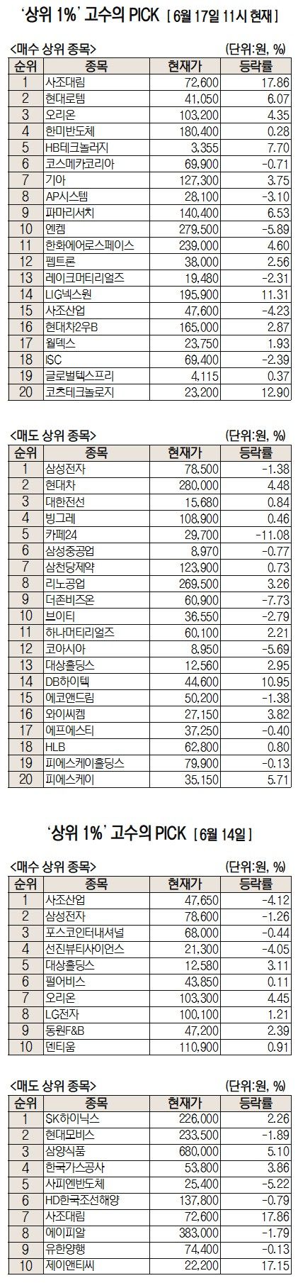 이날 미래에셋증권에 따르면 미래에셋증권 주식 거래 고객 중 최근 1개월 간 투자수익률 상위 1%에 해당하는 ‘주식 초고수’들이 오전 11시까지 가장 많이 사들인 종목은 사조대림으로 집계됐다.