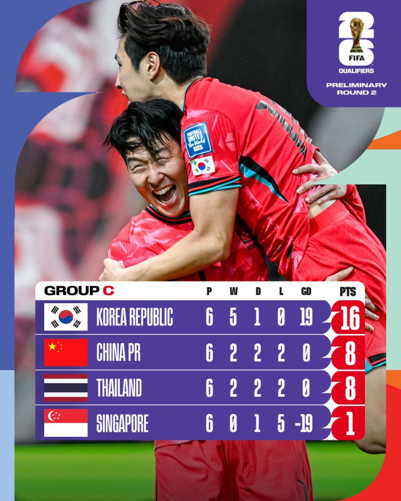 반면 중국은 승점 확보에 실패해 승점 8(2승 2무 2패)에 그쳤다. 뒤이어 열린 태국과 싱가포르의 경기에서 태국이 3-1로 승리해 승점 8을 만들었다. 두 팀이 골득실(0), 다득점(9)이 모두 동일해 서로 간의 상대 전적을 따져야 했고 중국이 태국 상대 1승 1무로 앞서면서 중국이 2위, 태국이 3위가 됐다. 중국은 한국전 패배에도 아주 간신히 3차 예선 진출을 확정 지었다.